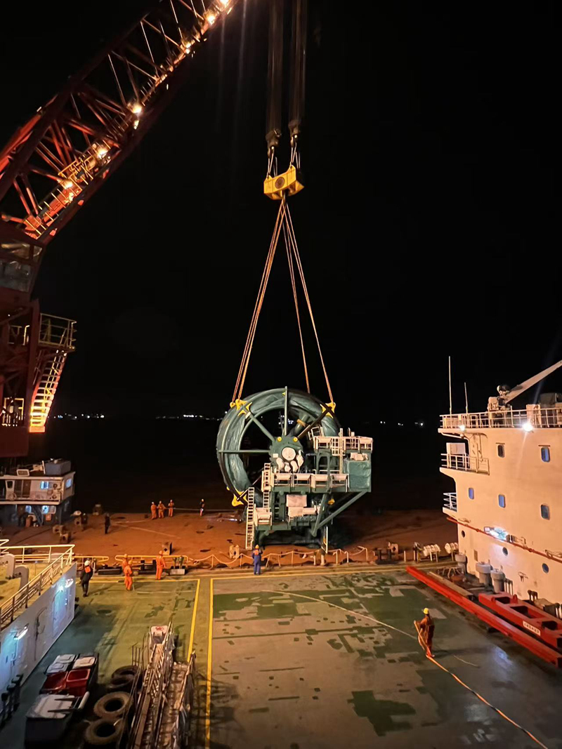 针对250吨货物的吊装需求,需配套4只单只起吊负荷达80吨的重型卸扣,每只卸扣重量都远超常人想象,如何精准将卸扣运至指定吊点、稳妥完成连接,成为又一个亟待破解的难点。现场作业团队结合货物实际尺寸、吊点具体位置,反复研判、科学谋划、精准布局,最终确定依托门机辅助吊运卸扣的最优方案。随着门机缓缓启动,重型卸扣被平稳吊运至货物顶端附近,此时,两名作业人员稳立登高车操作平台,精准靠近吊点、凝神聚力、精细操作,小心翼翼调整卸扣角度与位置,规范完成卸扣与吊点的紧固连接,成功实现高空作业与大件设备的无缝衔接,顺利破解了超高货物挂钩的“卡脖子”难题,为后续吊装打通了关键堵点。待货物顶端4只卸扣全部挂设完毕后,现场队员们没有丝毫懈怠,迅速转入到后续准备工作,将吊点连接的4条尼龙吊带逐一规整归位,对连接部位的牢固性进行反复检查、逐项确认,不放过任何细节漏洞,全力确保吊装作业万无一失。随着一声指令下达,驳船缓缓解缆,行驶至浮吊外档指定位置。早已做好充分准备的浮吊作业人员,立即启动吊装流程,大钩精准降落、平稳挂接吊带、匀速起升受力,操作人员眼神专注、动作娴熟规范,每一个环节衔接流畅、精准到位,整套吊装流程一气呵成。码头的灯光愈发明亮,映照着队员们忙碌而坚定的身影,依托党工团突击队全体队员的高度默契与协同配合,最终仅用半小时,这台250吨的超大电缆设备便被平稳吊装至“泰海1”轮船舱内,圆满完成全部装船任务,既保障了交接班时段作业效率,又守住了安全生产底线,用实际行动交出了一份亮眼的攻坚答卷。